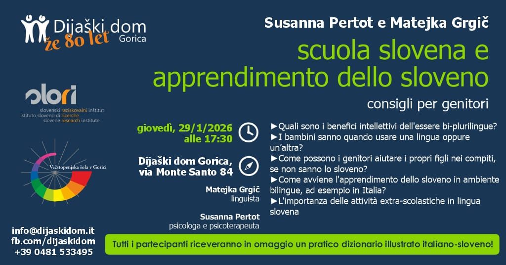 La Casa dello studente sloveno di Gorizia, l’Istituto comprensivo con lingua d’insegnamento slovena di Gorizia e l’Istituto sloveno di ricerche (SLORI) organizzano l’incontro Scuola slovena e apprendimento dello sloveno, giovedì29 gennaio 2026 alle ore 17.30 presso il Dijaški dom di Gorizia, via Monte Santo 84. L’incontro si svolgerà in lingua italiana.