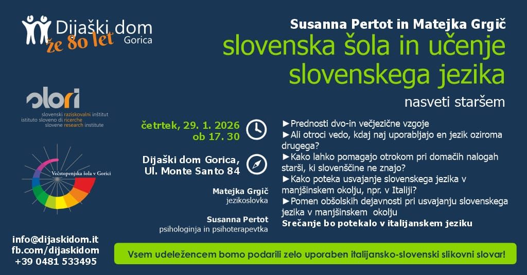 Dijaški dom Gorica, Večstopenjska šola v Gorici in Slovenski raziskovalni inštitut (SLORI) organizirajo srečanje Slovenska šola in učenje slovenskega jezika, ki bo v četrtek, 29. januarja 2026, ob 17.30 v prostorih Dijaškega doma Gorica, Ulica Monte Santo 84. Srečanje bo v italijanščini in je odprto za javnost.